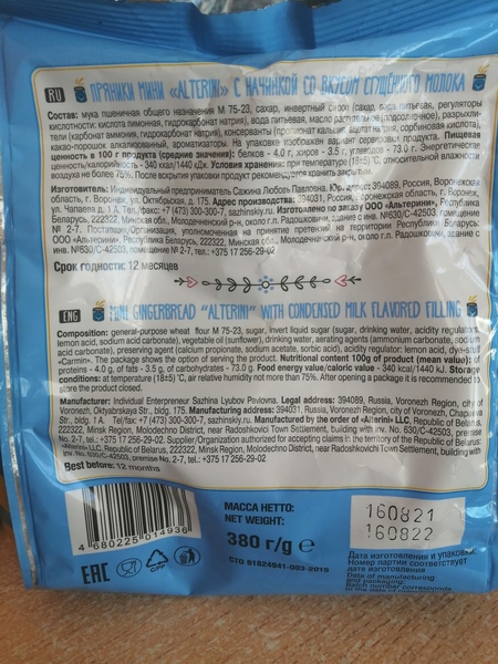 Согласно протоколу испытаний, выполненному лабораторной службой Брестского областного ЦГЭиОЗ, на одном из объектов торговли г. Пинска выявлена продукция, не соответствующая требованиям ТНПА – пряники мини «ALTERINI» с начинкой со вкусом сгущенного молока, масса нетто 0,38 кг, код ТН ВЭД ЕАЭС 4680225014936, дата изготовления 16.08.2021, срок годности до 16.08.2022, условия хранения – при температуре 18±5°С, относительной влажности воздуха не более 75%, изготовитель: ИП Сажина Любовь Павловна, 394089, Россия, Воронежская область, г.Воронеж, ул.Октябрьская, д.175, адрес места осуществления деятельности Россия, 394031, Воронежская область, г.Воронеж, ул.Чапаева, д.1А; импортёр: ООО «Альтерини», РБ, 222322, Минская область, Молодечненский район, около г.п. Радошковичи, здание с инв. №630/С42503, пом. №2-7, не соответствует требованиям пункта 5.5.9 Гигиенического норматива «Показатели безопасности и безвредности для человека продовольственного сырья и пищевых продуктов», утв. постановлением Министерства здравоохранения Республики Беларусь 21 июня 2013 г. №52; пункта 5.9 таблицы 5 Гигиенического норматива «Показатели безопасности и безвредности продовольственного сырья и пищевых продуктов», утв. постановлением Совета Министров РБ от 25.01.2021 №37; пункта 1.4 приложения 2 Технического регламента Таможенного союза 021/2011 «О безопасности пищевой продукции», утв. Решением Комиссии Таможенного союза от 09.12.2011 №880 по микробиологическому показателю – обнаружены БГКП в 1,0 г (протокол испытаний лабораторного отдела Пинского зонального ЦГиЭ от 24.03.2022 №4/01-2886г).