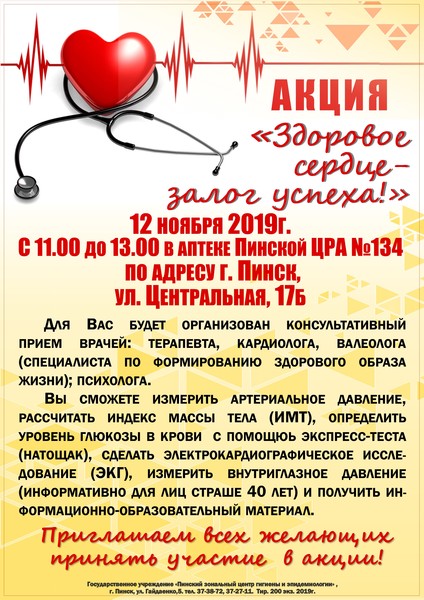 12 ноября 2019 года в аптеке Пинской ЦРА №134 по адресу ул. Центральная, 17б с 11.00 до 13.00 для жителей города Пинска и Пинского района будет организован бесплатный консультативный прием врачей – терапевта, кардиолога, валеолога, психолога.