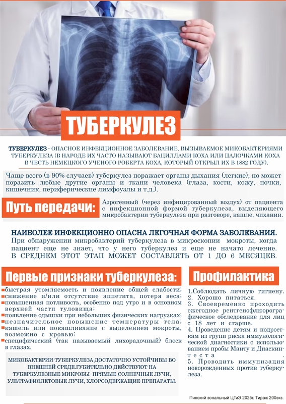 Ежегодно 24 марта во всем мире проводится День борьбы с туберкулёзом. На сегодняшний день данное заболевание не теряет своей актуальности, так как ежегодно регистрируются случаи туберкулеза. В 2024 году на трудоспособное население пришлось 80,0 % заболевших.