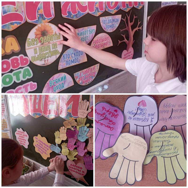 Учащиеся составляли пословицы со словом забота, искали синонимы в облаке слов, обсуждали проявление заботы героев мультфильма, искали выход в предложенных ситуациях, познакомились с заповедями матери Терезы, создавали портрет воспитанного и невоспитанного человека, озеленили дерево доброты и заботы своими заботливыми поступками. Беседа прошла активно, учащиеся расширили свои знания о нравственных основах общения, нравственных чувствах. На занятии формировалось гуманное отношение к окружающим людям, живой природе.