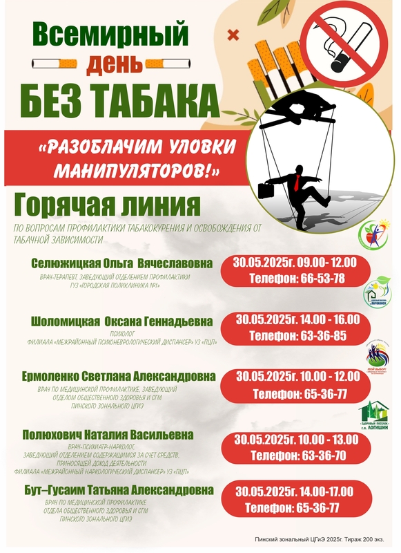 По случаю проведения масштабной антитабачной акции, приуроченной к Всемирному дню без табака, утвержден подготовленный Брестским областным ЦГЭиОЗ план информационно-образовательных, консультативных и иных мероприятий с 26 мая по 30 июня, утвержденный приказом главного управления по здравоохранению облисполкома. Такие мероприятия могут быть разными, в основном они имеют просветительскую направленность и призваны дать людям знания о том, как влияет табак на их здоровье и как при помощи привлекательных потребительских характеристик производители табачных изделий могут вводить в заблуждение.