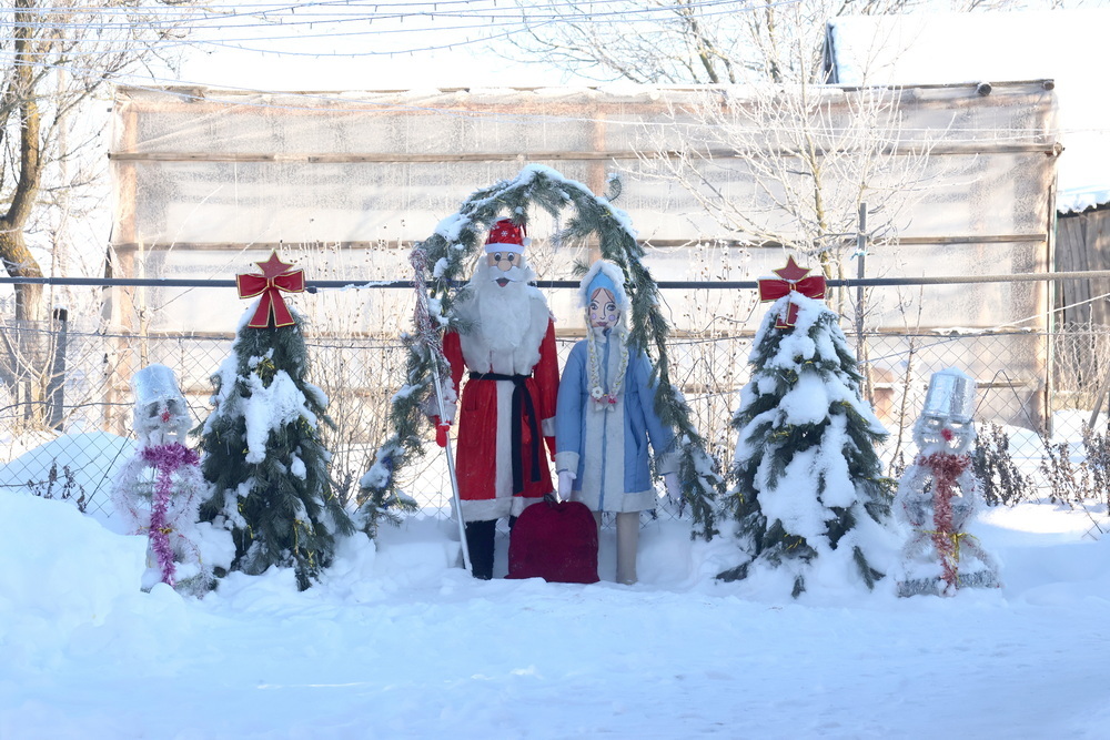 – Идеи черпаю из интернета, многое подсказывают внуки. В первую очередь для них и делаем всю эту красоту, чтобы они приезжали к бабушке с дедушкой, как в сказку, – говорит хозяйка усадьбы. – Для создания образов используем природный материал, старые ненужные вещи, в том числе и детскую одежду. Например, костюм Снегурочки сделан из куртки дочери, Деда Мороза – из старого красного халата.