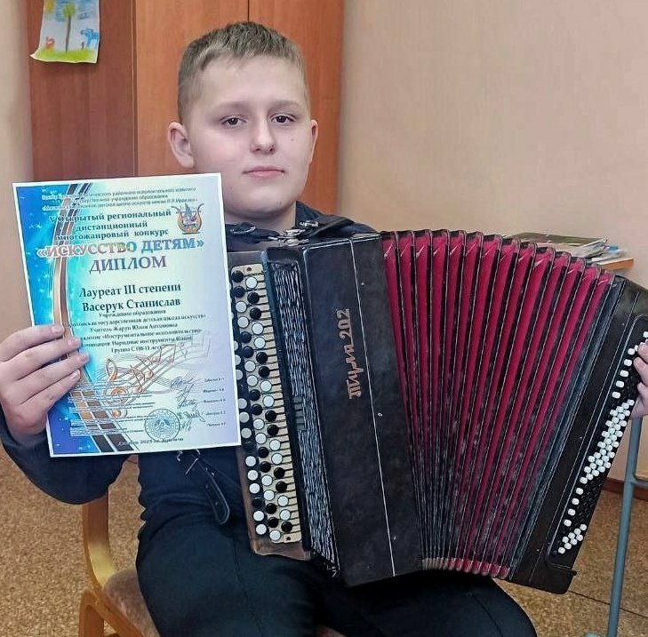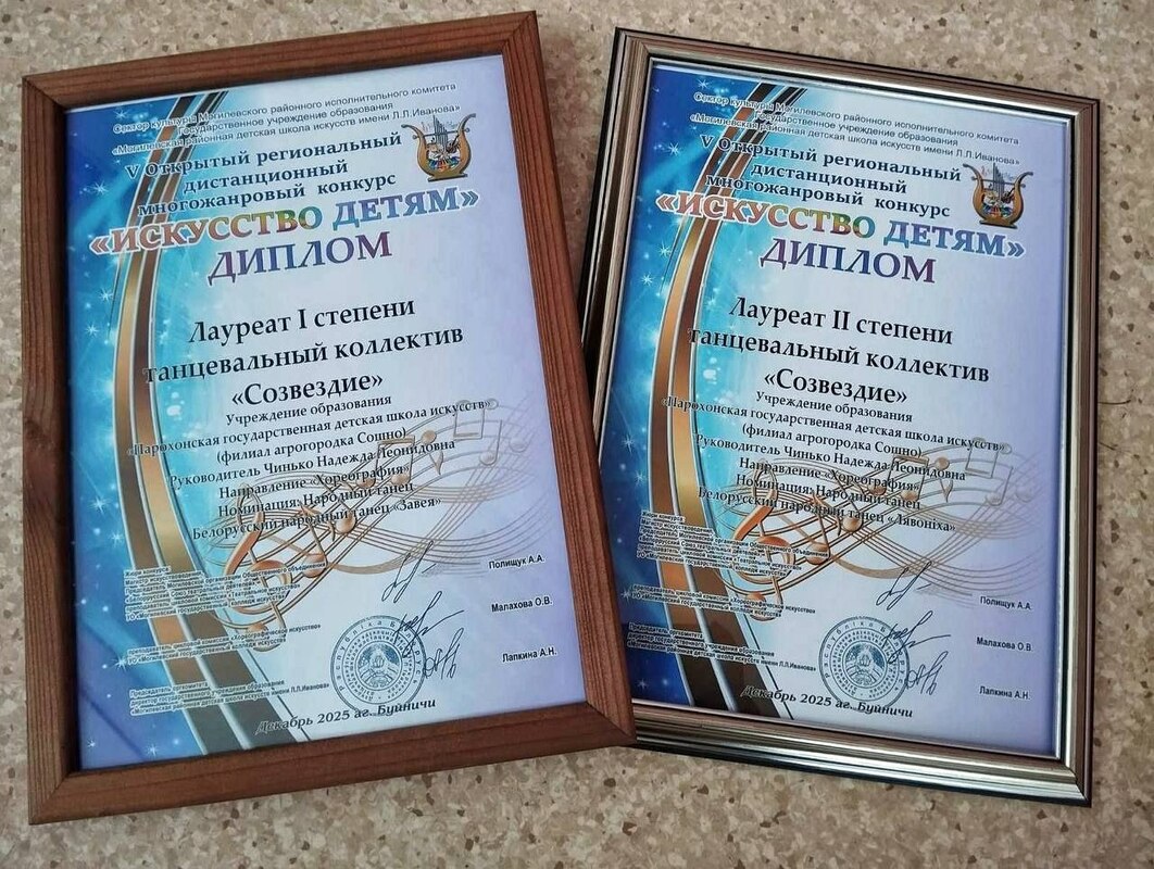 За участие в V Открытом региональном дистанционном многожанровом конкурсе «Искусство детям» награждены танцевальный коллектив «Созвездие» – дипломом лауреата I и II степени в номинации «Народный танец»; учащийся Станислав Васерук – дипломом лауреата III степени в номинации «Инструментальное исполнительство».Педагоги Надежда Чинько и Юлия Жарун отмечены благодарностью за высокий профессионализм и подготовку участников конкурса.
